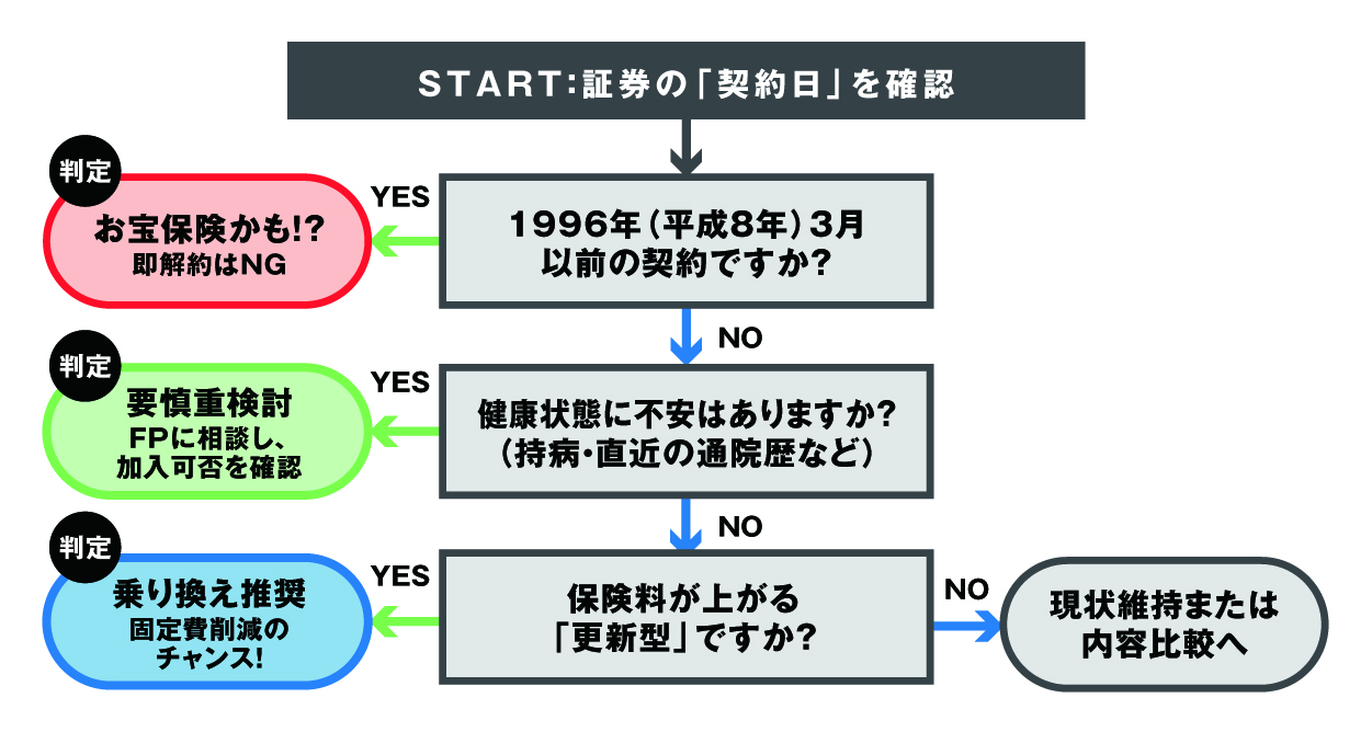 予定利率が高い「お宝保険」は継続し、更新型で保険料が上がる場合は見直しを推奨。目的と契約時期から乗り換えの可否を論理的に判定します。
