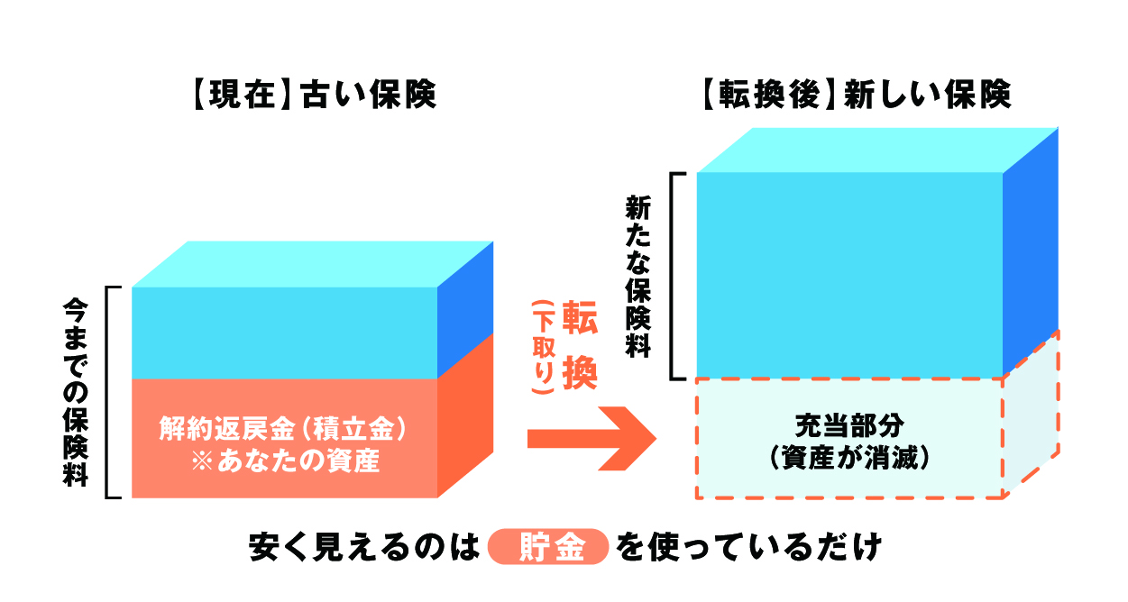 転換は現在の解約返戻金を新契約の保険料に充当する「下取り」制度。目先の保険料は安くなるが、資産(積立金)を取り崩す仕組みであることを理解すべきです。